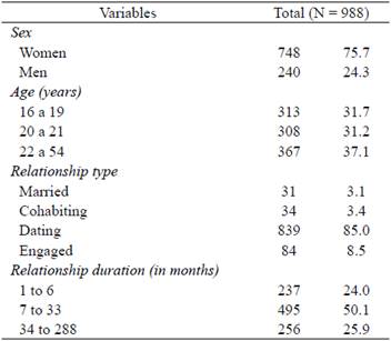 The study was comprised of 988 Peruvian youth and adults, being 748 women and 240 men, whose ages ranged from 16 to 54 years (Mean = 21.26; SD = 3.83), and who had been in a relationship for at least one month. The participants were either married, living with their partners, engaged, or dating. All the participants belonged to a middle social class in regard to socioeconomic status. In order to better control age variability, the participants were divided into three groups: From 16 to 19; from 20 to 21; and from 22 to 54 years. For further details, see table 1. For the factorial invariance analysis, 240 women were selected randomly from the total (n=988). This was done to equate the subgroups according to gender (Van de Schoot, Lugtig, & Hox, 2012).