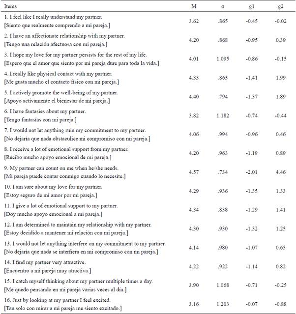 In table 3, the central tendency and variability measures are presented. The mean reveals that item 9 ("My partner can count on me when he/she needs") presents the highest value while item 16 ("Just by looking at my partner I feel excited") presents lowest value. The standard deviation of items 3, 6, 15, 16 was the highest with values greater than one. On the other hand, all items have negative asymmetry that reveals a tendency towards higher scores. Accordingly, kurtosis of items 4, 5, 9, 10, 11, 12 present a higher concentration of data around the center of its distribution.