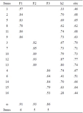 In order to verify the factor structure of the theoretical proposal, CFA is used. Therefore, a three-dimensional factor structure composed by 16 items was modeled. This model presents the following satisfactory goodness-of-fit parameters: (χ2 (101) = 349.85; χ2/df =3.46; CFI =.99; RMSEA=.05 [.04, .06]; SRMR = .05). The factor loading, and the inter-factor correlation are shown in Figure 1.