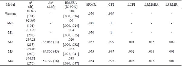 Once the STLS-R factor structure was identified, the invariance across gender was progressively explored: configurational invariance (M1), metric invariance (M2), strong invariance (M3, Byrne, 2008). First, the model adjustment was examined without constraints in both subgroups (men and women) obtaining similar values. Subsequently, the STLS-R structure between subgroups (configurational invariance, M1) was analyzed, presenting optimal values, with χ2(202) = 203.20; CFI =.1; SRMR =.050 y RMSEA = .004 (.000, .025). These results indicate that M1 can be a referential model upon which one can set up constraints in models M2, M3, M4.