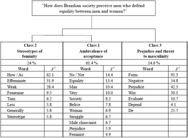 In Class 1, called "Ambivalence of Acceptance", the content is more grounded in the consequences that men are subject to when they decide to engage in a struggle for rights that, in the first instance, would not be their own. In this class, the significance of the X2 of the words (Figure 1 - second column) No/Not, Equality, Man, Very, Society, Believe, Women, Struggle, Male chauvinist, Prejudice, and Feminist indicates that they organize its semantic content.