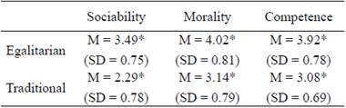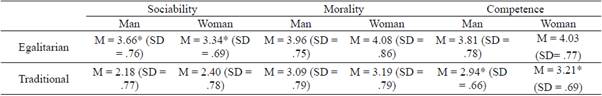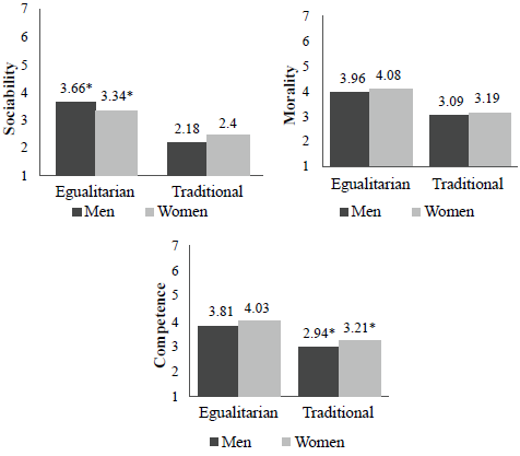 Study 2 verified that the perception of the targets in terms of sociability, morality, and competence is influenced both by the type of positioning (egalitarian or traditional) and by the gender of the targets (man or woman). However, the participant's gender had no influence on the results found. The fact that the gender of the participants (men and women) did not influence the results does not compromise the conclusions we can reach in this paper because, according to Fiske (1998), stereotypes are socially shared beliefs that can be accepted by people and individuals as well as groups. Thus, we will present the main results found without comparing the gender of the participants, but according to the type of positioning and gender of the character presented in the experimental situation used.