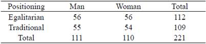Sociodemographic characteristics (gender and age). At the end of the questionnaire, two questions were included to ascertain whether the experimental manipulation had produced an effect. The first asked about the gender of the character in the situation presented. The second asked about the extent to which the participant considered the character to be egalitarian or traditional with regard to women's struggles. It is highlighted that the percentage of correct answers to these questions was higher than 98% and only these participants were considered in the study.