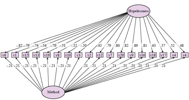 On the other hand, it must be taken into account that construct validity for balanced scales is particularly difficult, such as the case of BHS, since these scales are designed to avoid acquiescence having the same number or approximately the same number of direct and inverse items. In these cases, the items tend to group according to their semantic contents (Vautier & Pohl, 2009; Vautier, et al., 2004). In fact, in the exploratory factor analysis of balanced scales, factors arised that are not based on the theoretical dimension but on the polarity of the item, which is known as a method factor (Savalei & Falk, 2014), meaning that the two-factor structure of the BHS could be the cause of the method used (Innamorati et al., 2014).