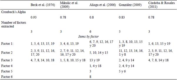 It is known that the classical factor analysis methods that start from the Pearson correlation matrix tend to oversize the number of factors when the data are dichotomous, especially when there are few items by factor or when the factorial weights are small (Fava & Velicer, 1992; Garrido, Abad & Ponsoda, 2011). In the present analysis, these considerations were taken into account and tetrachoric correlations were worked on. In this phase the results indicate that the versions of three factors are better than those that propose more than three factors, even an adjustment of the versions with five and six factors was not achieved since the covariance matrix of the latent variables is not defined positively. A deeper analysis shows correlations greater than one between two factors, which are considered estimates outside the admissible ranges and is a sign that the model is incorrect, the best fit was obtained with the structure factorial proposal proposed by Beck et al., (1974).