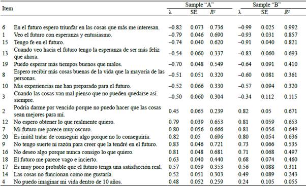 Table 3 shows the factorial weights (λ) obtained on the general factor we call "Hopelessness". The items were organized from higher to lower factorial weight in sample "B", which is where this model presents the greatest adjustment. In the case of sample "B", item 4 had a low factorial weight (λ = 0.24). However, this same item for sample "A" had an acceptable factorial weight (λ =0.48). All those items whose factorial weights are negative (6, 1, 15, 13, 19, 8, 10 and 3) measure in the case of the two-dimensional model, the dimension called optimism, the reliability analysis using the Kuder - Richarson statistics showed good reliability (KR-20 = .916), while items with a negative view (2, 12, 7, 20, 9, 16, 18, 17, 14 and 4) measure pessimism with a good level of reliability (KR-20 = .926). In the case of the one-dimensional model, the total reliability of the scale was high (KR-20 = .948).