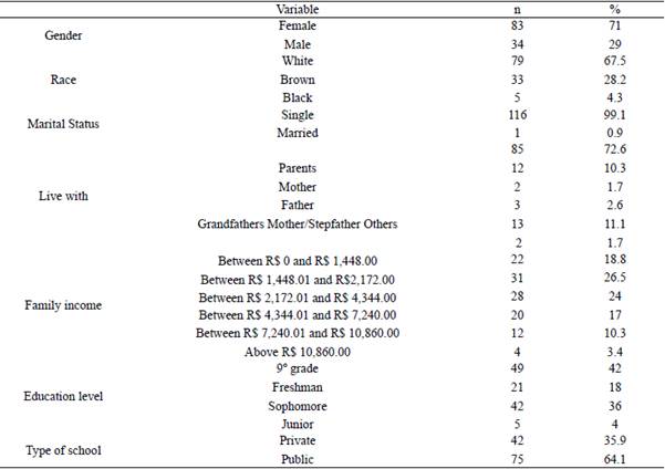 The sample selection was carried out by intentional non-probability sampling, from the researchers' contacts network. The sample consisted of 117 adolescents, aged 13 to 17 years (M = 15.14 years; SD = 1.06) who were attending elementary or high school in a city located in the north of Rio Grande do Sul state, Brazil. The teenagers included in the research were only those who got authorization from parents and/or guardians after signing the Free and Informed Consent (TCLE) and adolescents who signed the Free and Informed Assent (TALE). Teenagers who did not obtain parental authorization, or who were away from school activities during the data collection time, were not included in the sample.