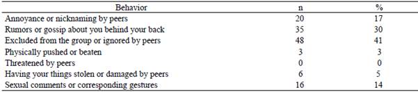 Regarding the behavior of intentional bullying victimization that caused suffering, most of the participants indicated that they were excluded from the group and were victims of rumors or gossip behind their backs. The findings corroborate the results of another research that used ECVB and found that the most frequently reported behaviors were: having been harassed or ignored (60.9%), having been victim of rumors and gossips (42.8%), and having been excluded from the group (42%) at some point in school life (Cavalcanti, Coutinho, Pinto, Silva, & Do Bú, 2018). In the study by Leader et al. (2018), victims also referred to the exclusion and spread of rumors as the most frequent ways of bullying.