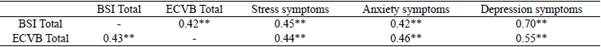 Correlation analyzes were performed between the constructs investigated (symptoms of depression, anxiety, and stress, suicidal ideation, and victimization of bullying) and the participants' age. The Spearman test indicated a single correlation between age and victimization of bullying. The negative correlation suggests that with increasing age there is a decrease in victimization, or the younger the teenager, the greater the victimization (rho = -0.19; p = 0.04). However, this correlation must be interpreted carefully considering the magnitude (weak correlation) and the sample size.