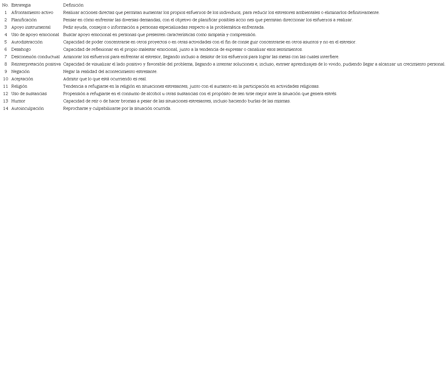Según estos autores, cada individuo tiende a utilizar diferentes estrategias de afrontamiento dependiendo de los esfuerzos que cada uno realice y la forma en que equilibre sus reacciones emocionales. De hecho, se ha dicho que se adquieren por aprendizaje o por hallazgo fortuito en una situación de emergencia, y que pueden ser adaptativas -es decir, que reducen el estrés y contribuyen a la salud a largo plazo- o desadaptativas -aquellas que mitigan el estrés a corto plazo, pero no promueven la salud a largo plazo- (Girdano & Everly, 1986). Específicamente, Carver (1997) distingue catorce estrategias de afrontamiento, cuyas defi niciones se pueden encontrar en la Tabla 1.