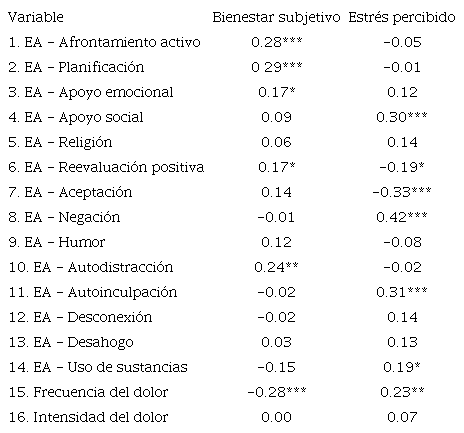 Por otra parte, respecto a la relación entre las variables -como se puede observar en la Tabla 3-, destaca la co rrelación obtenida entre el bienestar subjetivo y el estrés percibido, que fue negativa (r = -.30); así como que entre las estrategias de afrontamiento que correlacionan más alto con el bienestar subjetivo se encuentran la planificación (r = .29) y el afrontamiento activo (r = .28), mientras que con la frecuencia del dolor el bienestar subjetivo presentó una correlación inversa (r = -.28). Asimismo, el estrés percibido presenta una mayor correlación con la negación (r = .42), y la autoinculpación (r = .31), mientras que con la aceptación presenta una correlación inversa (r = -.33).