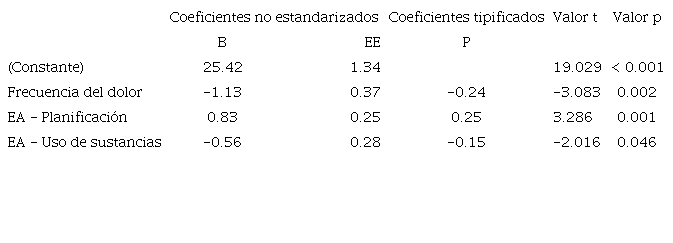 Posteriormente, se calcularon los predictores de bien estar subjetivo y estrés percibido por medio de la regresión lineal múltiple con el método de pasos sucesivos, el cual permite eliminar aquellas variables que no resultan sig nificativas a la hora de predecir la variable dependiente. Así, en cuanto al bienestar subjetivo, el análisis muestra resultados significativos (F(3,145 ) = 9.439; p < .001) con un R2 de .16 (R2adj = .15), donde la planificación fue un predictor significativo positivo, mientras que la frecuencia del dolor y el uso de sustancias fueron predictores significativos negativos (véase Tabla 4).
