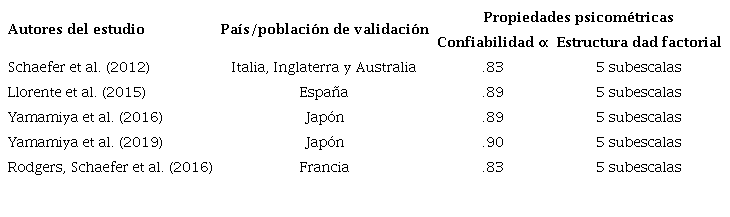 La primera versión del SATAQ-R fue desarrollada por Cusumano y Thompson (1997) en Estados Unidos, mientras que el ajuste de las versiones SATAQ-3 y SATAQ-4 fue realizado por Schaefer et al. (2012). La última adaptación ha sido validada en países europeos -Italia, Inglaterra, España, Francia-, asiáticos -Japón- y en el continente australiano, estudios en los que se conservaron los adecuados índices de consistencia interna y se mantuvo su estructura factorial original (Llorente et al., 2015; Rodgers, Schaefer et al., 2016; Schaefer et al., 2012; Schaefer et al., 2015; Yamamiya et al., 2016; Yamamiya et al., 2019) (véase Tabla 1); condición que, aunque facilita su uso en diferentes poblaciones de Latinoamérica, no permite valorar el aspecto en Colombia.