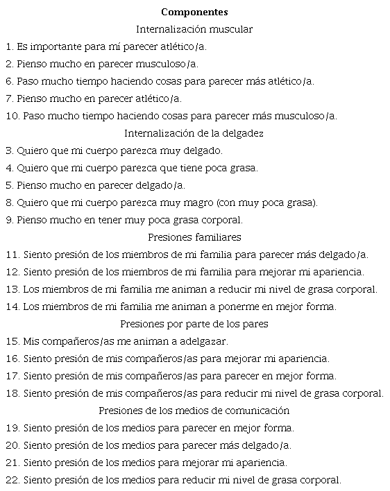 Por otra parte, se encontró que el Cuestionario de actitudes socioculturales sobre la apariencia (SATAQ-4), una revisión del SATAQ-3 -que no contaba con una subescala que midiera internalización del ideal muscular-, que tiene como propósito proporcionar una evaluación más completa de las presiones sociales, pues incluye elementos relacionados con la familia, los compañeros y los medios de comunicación con el fin de obtener una medida de internalización del ideal de delgadez y muscular más enfocada, así como ajustar sistemáticamente la confiabilidad y la validez convergente de las puntuaciones en la nueva medida en muestras femeninas, masculinas, e interculturalmente (Schaefer et al., 2015; Thompson et al., 2004).