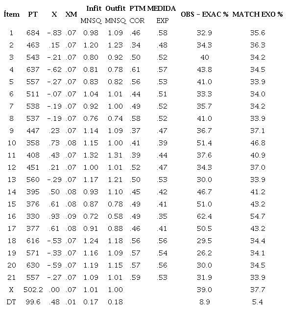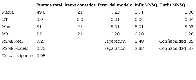 Para evaluar la confiabilidad, validez, estructura, discriminación y determinación de puntos de corte, se usó el modelo Rasch; mientras que, para evaluar el funcionamiento diferencial de ítems, se calculó el índice Mantel Haenszel (MH). Por otra parte, la validez concurrente se evaluó a través del análisis de covariación y los índices de correlación de Pearson -índice de significación > .05-. En general, la versión adaptada del instrumento obtuvo un nivel de confiabilidad alto, lo cual se refleja tanto en el índice de separación (2.63) como desde la teoría tradicional, a partir del alfa de Cronbach (a = .87) (véase Tabla 3).