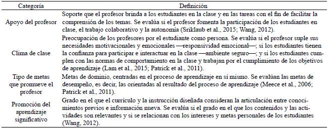 Se aplicó una entrevista semiestructurada sobre los aspectos del ambiente de clase, organizada alrededor de cuatro categorías: apoyo del profesor, clima de clase, tipo de metas que promueve el profesor, y promoción del aprendizaje significativo (véase Tabla 2 y Apéndice B).