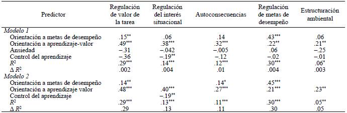 Asimismo, los coeficientes estandarizados de los predictores individuales indican que la orientación al aprendizaje-valor fue un predictor importante de todas las estrategias de autorregulación de la motivación, especialmente las estrategias de valor de la tarea y de regulación de interés situacional; mientras que la orientación a metas de desempeño fue un predictor importante de las estrategias de valor de la tarea, autoconsecuencias, y, especialmente, de la orientación a metas de desempeño.