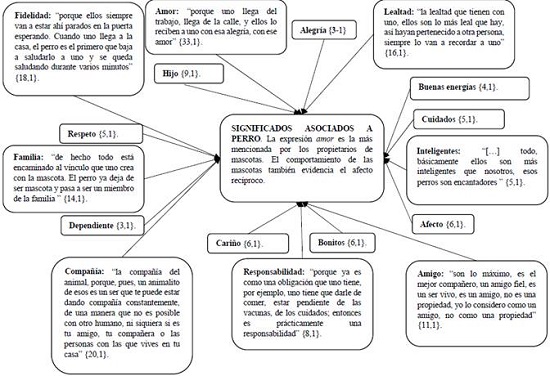 A partir de las técnicas de recolección de información se pudo establecer que los perros poseen una gran cantidad de significados afectivos asociados. Por ejemplo, se encontró que las personas les otorgan roles como "hijos", "parte de la familia" y "canalizadores de energía", entre otros; y algunas de las expresiones presentadas en la Figura 1 indican que, además de su rol familiar, se caracterizan con rasgos de lealtad y de bondad.