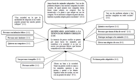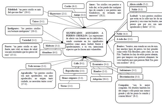 En la fase cuantitativa, en cuanto a la estructura por jerarquía y valor expresivo, se identificó la palabra "amor" como núcleo central, y las expresiones que la siguieron en orden de jerarquía y frecuencia fueron "lealtad" y "agradecimiento"; en el sistema periférico, se encontraron las palabras "fidelidad", "compañía", "responsabilidad", "cuidado", "adopción" y "cariño", de modo que, con este lenguaje, los individuos construyen el contexto social y los significados atribuidos a los perros criollos.