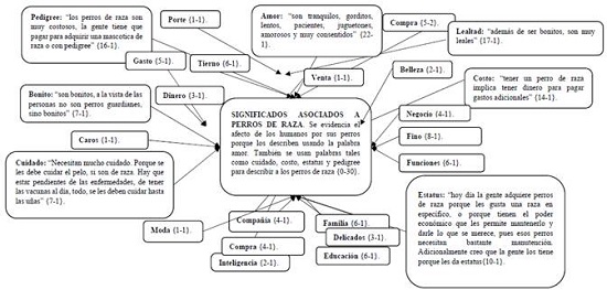 Por otra parte, los significados asociados a los "perros de raza" se construyen con factores emocionales y de cuidado hacia la mascota, donde aparecen rasgos asociados con la raza del perro, los cuidados que deben seguirse, el costo de la alimentación y el mantenimiento, entre otras (véase Figura 3). En la fase cuantitativa, en lo expresado por los participantes en cuanto a la estructura por jerarquía y valor expresivo acerca de las representaciones sociales respecto a los perros de raza, se encuentra, igualmente, la palabra "amor" como el núcleo central, seguida, en términos de frecuencia, de las expresiones "cuidado" y "fidelidad". Las palabras que continúan son, en orden: "lealtad", "compañía", "belleza", "amigo", "compra" y "costo".