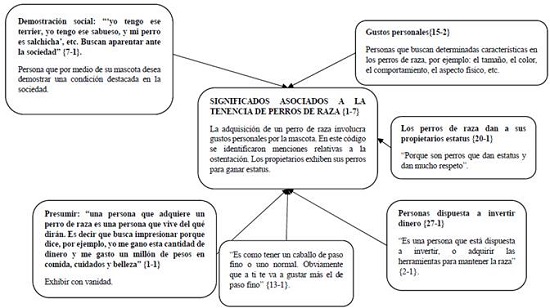 En esta investigación, las expresiones identificadas en el sistema periférico ubican a los perros de raza en condición de objetos, puesto que se pueden comprar y porque se les atribuye valor estético, como también los reportó Holbrook y Woodside (2008). Por lo tanto, se identifica que la tenencia de perros de raza está orientada a gustos personales y afectivos, y que, a su vez, está relacionada con el cumplimiento de logros personales, como alcanzar estatus, ejercer actividades de demostración social, e incluso compartir experiencias en torno a la raza de la mascota, con lo cual se adquiere, además, una identidad a través de las características del perro; es por ello que la raza de la mascota es muy relevante y se considera un aspecto diferencial a la hora de conformar estos grupos sociales.