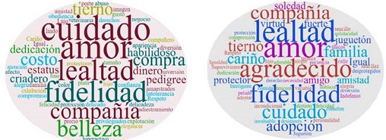 Asimismo, los resultados muestran la expresión "amor" como aquella de mayor relevancia entre los participantes, al definir a ambos tipos de perros. Adicionalmente, se pueden observar las palabras "lealtad" y "fidelidad" en ambos grupos, y también expresiones como "compañía", "cuidado", "responsabilidad", "familia", "amigo" y "amistad", lo cual demuestra que los significados de las representaciones sociales construidas en torno a los perros son el resultado de la relación entre el objeto -perros- y los individuos -propietarios de mascotas- (Navarro & Restrepo, 2013), que son tan cercanas que pueden llevar a las personas, incluso, al punto de considerar a una mascota como parte de la familia.