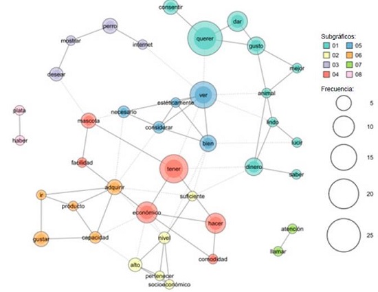 Por otra parte, para el análisis de los datos textuales, se tomó un corpus de preguntas abiertas, y, de acuerdo con el análisis de coocurrencias -que se puede observar en la Figura 7-, se encontró que ocho nodos describen las conceptualizaciones de los participantes acerca del consumo de productos o servicios de lujo para sus perros. En particular, el clúster de mayor frecuencia -en color azul turquesa- podría denominarse como "función de la compra de productos de lujo", donde resaltan palabras como "querer dar gusto", "consentir", "lucir", "dinero", entre otras. En dicho clúster, se evidencia una necesidad de satisfacer un gusto personal por mantener "lindos" a los perros, y que, a su vez, "ese gusto debe ser lucido". Por otra parte, el clúster de color rojo puede ser entendido como "el consumo de lujo es para los que tienen dinero", y en este resaltan palabras como "tener", "económico", "facilidades", "mascotas" y "comodidad", que se refieren a que en el caso en que las personas tienen comodidades u holgura económica, pueden permitirse el consumo de productos o servicios de lujo para sus mascotas.