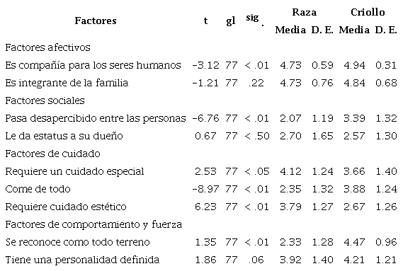Además, en cuanto al análisis de los atributos de los perros, se identificaron diferencias estadísticamente significativas en las siguientes afirmaciones: el perro de raza/ criollo "es una compañía para los seres humanos", "pasa desapercibido entre las personas", "requiere cuidado especial", "come de todo" y "requiere cuidado estético especial y se reconoce como todo terreno" (véase Tabla 1).