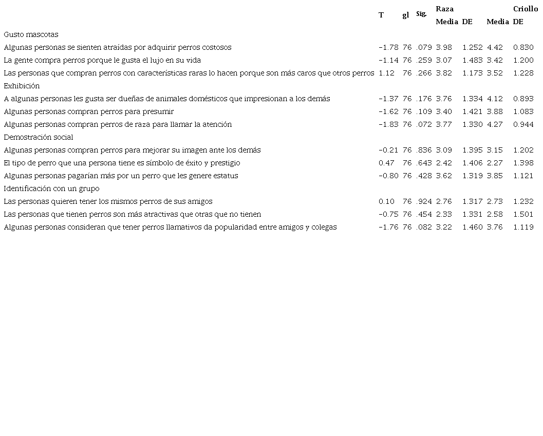 En cuanto a las prácticas de consumo, las diferencias estadísticamente significativas se observaron en las afirmaciones: "el tipo de perro que una persona tiene es símbolo de éxito y prestigio" y "las personas que tienen perros son más atractivas que otras que no tienen". Las afirmaciones como "algunas personas se sienten atraídas por adquirir perros costosos", "a algunas personas les gusta ser dueñas de animales domésticos que impresionan a los demás" y "algunas personas compran perros de raza para llamar la atención" muestran diferencias moderadas, según se puede observar en la Tabla 2.
