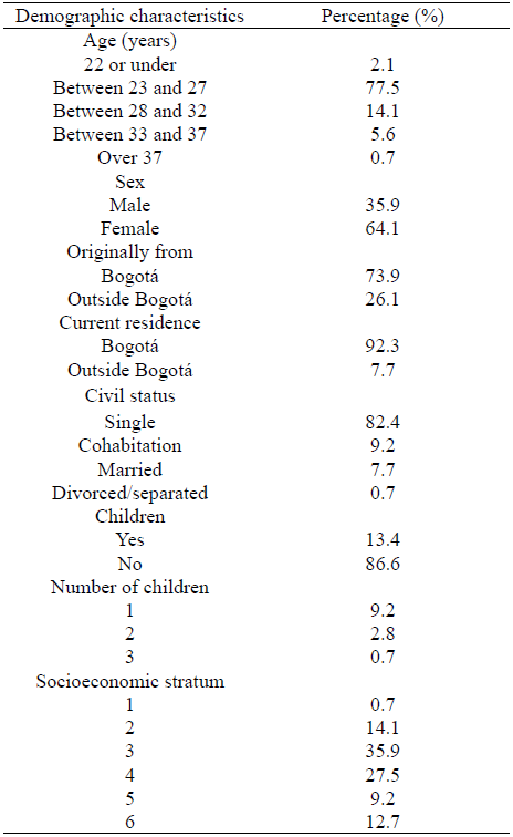 The participants of this research project were selected in a non-probabilistic manner, following a convenience sampling, which consisted of 142 professionals (51 men and 91 women) with undergraduate degrees obtained between 2011 and 2014. The participants were selected from different universities in Bogotá and by various electronic means. The main inclusion criterion was that they were working and were residents of Bogotá or nearby areas at the time they responded to the questionnaire.