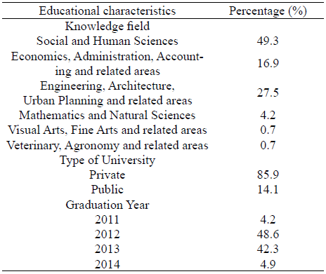 We contacted some public and private higher education institutions1 in Bogotá at their graduate offices or university programs/departments. We also used various electronic tools such as social networks, electronic newsletters2 or academic web pages with the goal of reaching a greater number of graduates belonging to universities that were not formally contacted. The Survey Monkey platform was used for the online questionnaire and, once we obtained approval from the universities contacted, they sent the invitation via e-mail to the graduates including a brief description of the project's objective and the link where they would find the informed consent and the questionnaire. The same procedure was used for social networks and electronic newsletter.