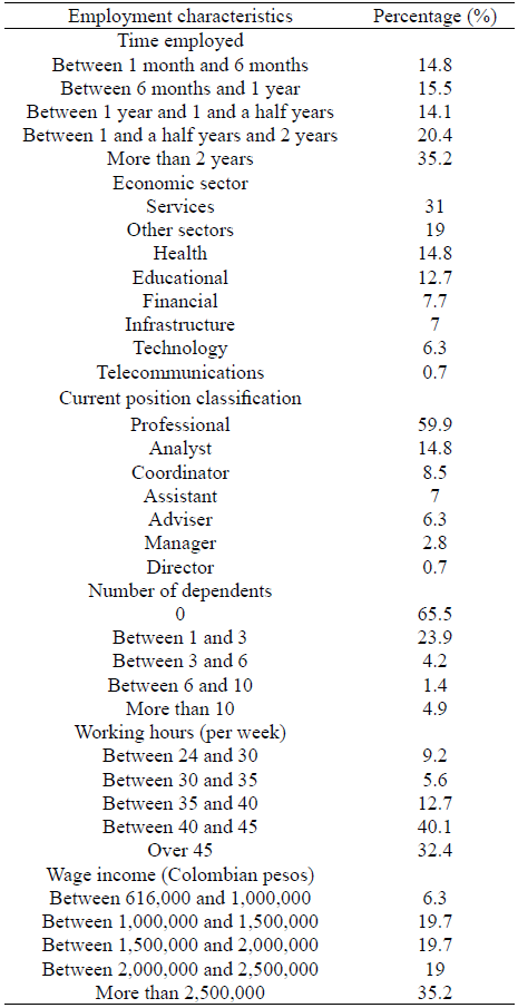 Table 2 describes the participants' educational characteristics. Here, we observe that the majority of participants belong to the field of Social and Human Sciences (49.3%), and attended a private university (85.9%). Table 3 shows the employment characteristics of the participants. Most people have been working for more than 2 years (35.2%) and belong to the service sector (31%). We can also observe that, for the most part, people work between 40 and 45 hours a week (40.1%), and their salary is over 2,500,000 pesos (35.2%).