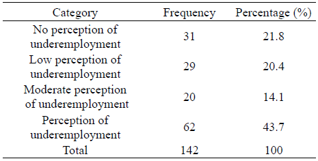 Table 5 presents the categories of different underemployment perception. To carry out the division into these four categories, the 25, 50, 75 percentiles of the distribution on the variable were taken as cut points.