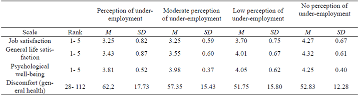 The data analysis showed that people with a high perception of underemployment have lower scores in the scales of general life satisfaction, job satisfaction, and psychological well-being compared to people who do not perceive it or who perceive it in a moderate way (see Table 6). The score for the distress scale showed similar results, that is, lower scores on people with high perception of underemployment compared to people who do not perceive it or who perceive it in a moderate way.