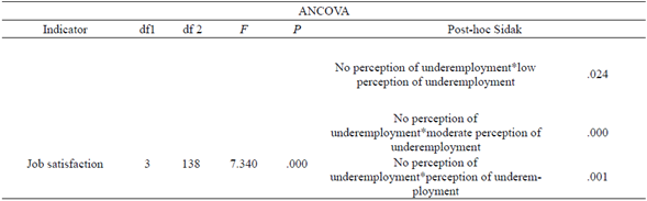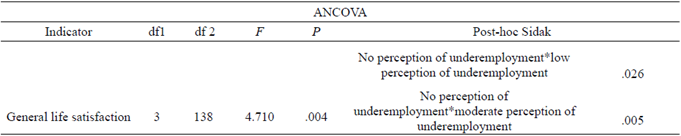 ANCOVAS were conducted to control the effect of PA and NA on the psychological well-being, job satisfaction, life satisfaction, and distress in accordance with the perception of underemployment. The results showed that there were no significant differences in psychological well-being (F (3, 138) = 0.991 p> .05) and in the distress indicator (F (3, 138) = 0.520 p> .05). However, they did show significant differences for job satisfaction (F (3, 138) = 7.340, p< .01), as well as in general life satisfaction (F (3, 138) = 4.710, p< .05) (see Tables 7 and 8).