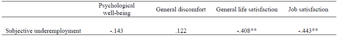 Furthermore, correlations were carried out to establish associations between subjective underemployment and indicators of distress and well-being (see Table 9). The results showed that after controlling the affect, the indicators of psychological well-being (r= -.143; p> .01) and distress (r= .122; p> .01) were not significantly related to subjective underemployment whereas job satisfaction (r= -.443; p< .01) and general life satisfaction (r= -.408; p<.01) are associated with negative and significant subjective underemployment, which indicates that the higher the scores in the subjective underemployment scale, the lower the scores in job satisfaction and general life satisfaction.