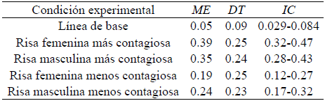 De otro lado, la comparación de las respuestas EMG entre las diferentes condiciones de risa más y menos contagiosa se basó en los valores descriptivos de amplitud -expresados en voltios- de las risas más contagiosas señalados en la Tabla 2 y en los siguientes valores de las risas no contagiosas: (a) risa femenina menos contagiosa: ME = 0.0208, DT = 0.0262, IC: 0.014-0.028; y (b) risa masculina menos contagiosa: ME = 0.0212, DT = 0.0236, IC: 0.015-0.027.