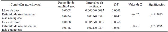 Además, en la comparación por pares se encontraron diferencias significativas entre la risa masculina más contagiosa y la femenina menos contagiosa (z = -1.66,p < .05), entre la masculina menos contagiosa y la femenina más contagiosa (z = -3.84,p < .05), y entre las masculinas más y menos contagiosas (z = -3.84, p < .05). Estos resultados señalan que existen diferencias significativas en las amplitudes EMG del músculo cigomático ante las diferentes risas a las que fueron expuestos los participantes.