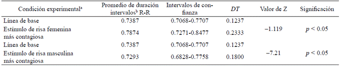 Como se puede observar, los valores de la Tabla 3 muestran que no existen diferencias significativas en el promedio de intervalos R-R entre la condición de línea de base y durante la exposición a las risas femenina y masculina más contagiosas. Así, se puede afirmar que los datos reportados no apoyan este componente de la tercera hipótesis (H3) de esta investigación.