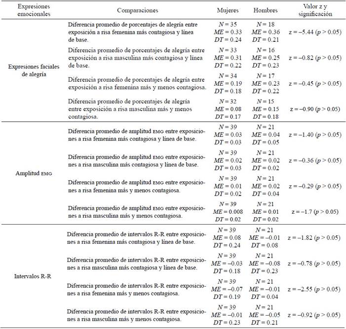 Por último, para determinar las diferencias de sexo relacionadas con las hipótesis verificadas, y ante la imposibilidad de utilizar pruebas paramétricas -como un análisis factorial-por violación de varios supuestos, se utilizó la prueba no paramétrica de Wilcoxon. Así, se partió de la idea de que la exposición a las condiciones de risas femenina y masculina más contagiosas debían producir mayores niveles de expresiones emocionales en comparación con los valores observados en la línea base y ante las condiciones de risa menos contagiosa, lo cual implica observar diferencias al comparar las diversas condiciones. Teniendo esto en cuenta, se compararon los datos de hombres y mujeres sobre la diferencia de los niveles de expresión facial, EMG e intervalos R-R entre las condiciones de risas más contagiosas y línea de base y entre estas y las condiciones de risas menos contagiosas.