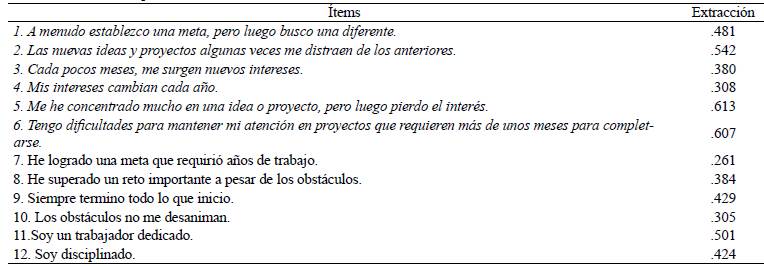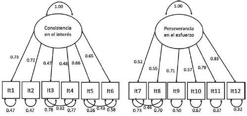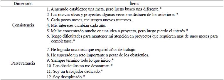 Específicamente, la prueba está divida en dos dimensiones: (a) consistencia, compuesta por seis ítems redactados de manera negativa que pretenden evaluar el grado en que una persona mantiene sus objetivos a largo plazo, lo que quiere decir que las personas con un mayor grado de acuerdo con las afirmaciones presentadas tendrán menor consistencia-debido a esto, en el análisis es necesario invertir las calificaciones-; y (b) perseverancia, que pretende evaluar el mantenimiento del esfuerzo a lo largo del tiempo a pesar de los obstáculos o los resultados adversos, a través de seis ítems que se responden en una escala Likert de 1 a 5, siendo 5 el mayor grado de acuerdo con la afirmación -la calificación de estos ítems se realiza de manera directa, ya que todos los reactivos están escritos de manera positiva; así, un mayor nivel de acuerdo representa mayores niveles de perseverancia en el sujeto-.