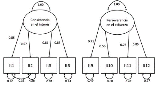 Sin embargo, contrario a lo propuesto desde el modelo teórico, los factores de perseverancia y consistencia funcionan de manera independiente, sin agruparse bajo un factor general de grit, y esto se encuentra tanto en el análisis de la estructura de Grit-O como en el de Grit-S, lo cual coincide con el meta-análisis de Credé et al. (2017).