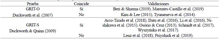 Como se mencionó más arriba, en la literatura se reconocen dos estructuras validadas de la prueba Grit: la versión original (Grit-O), compuesta por doce ítems (Duckworth et al., 2007), y la versión abreviada (Grit-S) compuesta por ocho ítems (Duckworth & Quinn, 2009). En general, en los análisis psicométricos realizados en distintas validaciones se observa una mayor variabilidad en las estructuras encontradas para la prueba Grit-O, pues en estas se encuentran desde tres factores (Kim & Lee, 2015) hasta la reorganización de ítems entre los dos factores tradicionales (Tyumeneva et al., 2014), e incluso la eliminación de algunos ítems de la original para obtener una estructura similar a la prueba Grit-S (Marentes-Castillo et al., 2019); mientras que, por otra parte, en la prueba Grit-S la gran mayoría de validaciones parecen coincidir con la estructura de la validación original (véase Tabla 1).