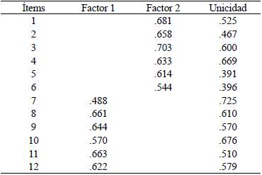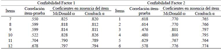 En la Tabla 4 se observa que los primeros seis reactivos cargan hacia el Factor 2, y los seis restantes al Factor 1, con valores superiores al mínimo requerido (≥ .3). Al realizar los análisis de confiabilidad, se obtuvo un omega general de McDonald de .838 (Factor 1 = .838; Factor 2 = .810) y un alfa general de Cronbach de .834 (Factor 1 = .836; Factor 2 = .807), que indican una alta confiabilidad.