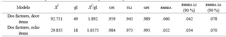 Finalmente, para el análisis factorial confirmatorio se llevaron a cabo comparaciones de modelos rivales con el modelo bifactorial con los doce reactivos y con la propuesta de ocho ítems. Ambos modelos muestran índices de ajuste adecuados y bajo nivel de error (véase Tabla 6). Asimismo, en los modelos de ecuaciones estructurales se encontró coeficientes positivos y superiores a .4 entre los reactivos con su factor correspondiente, y, en la mayoría de los ítems, cargas bajas de covarianza entre las variables latentes, así como coeficientes de carga suficiente en cada factor para explicarse de manera independiente (véase Figuras 1 y 2).
