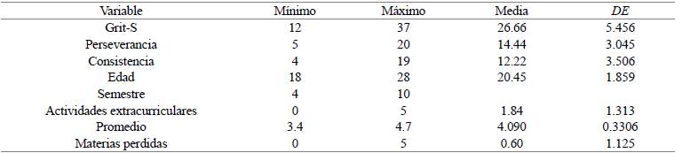 Para llevar a cabo el análisis de correlación se realizaron las pruebas de normalidad de Kolmogorov-Smirnov (n > 50; p > .05) junto con los análisis de asimetría y curtosis (±1.5), en los que se encontró una distribución no normal de los datos para la prueba Grit-S (Z = .124; p = .029; A = .361; C = .025) y las subescalas de perseverancia (Z = .139; p = .008; A = -.876; C = ,574) y consistencia (Z = .137; p = .010; A = -.135; C = -.237), por lo cual se realizó un análisis descriptivo correlacional con el coeficiente de Spearman (correlaciones entre -1 y 1).