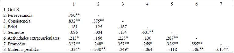 En el análisis de correlación de cada una de las subescalas con el desempeño académico se encontró que la subescala de perseverancia correlacionó de forma moderada con el promedio académico (rs(88) = .248; p = .019) y el número de materias perdidas (rs(88) = -33; p = .002); mientras que la subescala de consistencia tuvo una correlación moderada con el promedio académico (rs(88) = .357; p = .001), con el número de programas extracurriculares (rs(88) = .225; p = .034), y con el número de materias perdidas (rs(88) = -.249; p = .018).