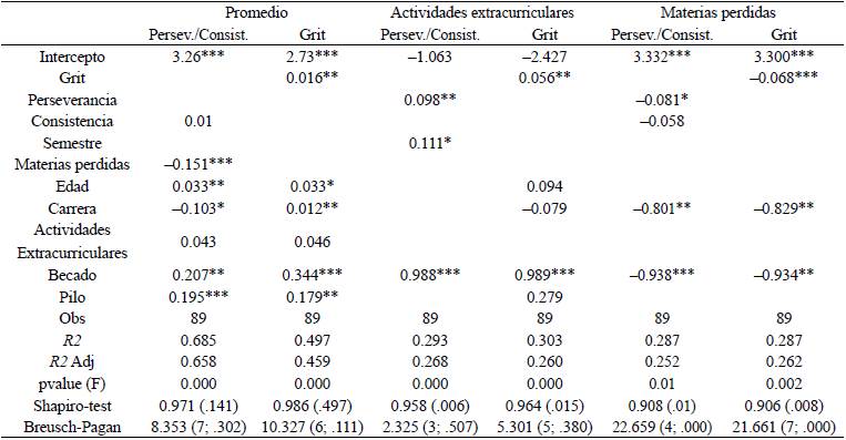 En los modelos de regresión sobre el número de actividades extracurriculares desarrolladas por los estudiantes no se cumple el supuesto de normalidad en ninguno de los dos modelos (Persev./Consist.: W = .958;p = .006; grit: W = .964, p = .015), pero sí el de homocedasticidad (Persev./ Consist.: Chi2(3) = 2.325, p = .507; grit Chi2(5) = 5.301, p = .380), y en el caso de los modelos de regresión sobre el número de materias perdidas no se cumple ninguno de los supuestos: ni el de normalidad (Persev./Consist.: W = .908; p = .01; grit: W = .906, p = .008), ni el de homocedasticidad (Persev./Consist.: Chi2(4)=22.659, p < .01; grit: Chi2(7) = 21.661, p ≤ .01), por lo que se puede afirmar que, a diferencia del modelo de regresión para el promedio académico, en el caso de los últimos dos modelos de regresión de las nuevas medidas del desempeño académico -actividades extracurriculares y materias perdidas-, los hallazgos no son generalizables a una muestra más amplia de la aquí analizada.