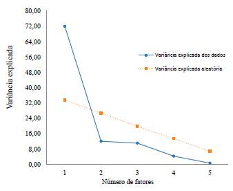 Entretanto, pelo fato de o critério de Kaiser ser um método mais simples, optou-se por uma estratégia mais refinada para extinguir qualquer dúvida referente à quantidade de dimensões a serem extraídas, por isso realizou-se uma análise paralela com base no critério de Timmerman e Lorenzo-Seva (2011). Pôde-se observar que a estrutura unifatorial da escala foi corroborada por meio da análise paralela, uma vez que, ao comparar a variância explicada dos dados reais e aleatórios, observa-se que, somente quando o número de fator é igual a 1, os dados reais explicam a variância em maior porcentagem (72.04 %) do que os dados aleatórios (33.59 %), como pode ser observado na figura abaixo.