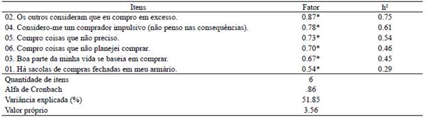 Em suma, todas as cargas fatoriais apresentaram valores superiores a .30, atendendo ao critério de saturação mínima sugerido na literatura (Pasquali, 2010). Os seis itens descritos na Tabela 1, compõem a estrutura final do instrumento. No entanto, a estrutura fatorial da medida não permaneceu a mesma em comparação com a medida original e a validação brasileira. Com base no critério de Kaiser, o resultado sugeriu a unidimensionalidade do instrumento, com valor próprio de 3.56, responsável por 51.85 % da variância total das respostas dos indivíduos. A maior saturação foi encontrada no item 2 = 0.87 ("Os outros consideram que eu compro em excesso") e a menor, no item 1 = 0.54 ("Há sacolas de compras fechadas em meu armário"). Ademais, o alfa de Cronbach foi igual a 0,86, o que sugere que o instrumento apresente consistência interna satisfatória.